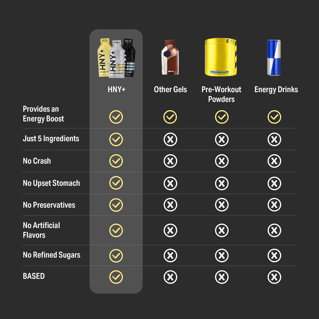 Most energy gels are packed with processed sugars and artificial additives. HNY+ is built around organic honey — a natural carb source your body can absorb quickly without the crash. We keep the formula simple: honey for clean energy, electrolytes to keep you balanced, and natural caffeine in the Buzz gels if you want an extra boost. No junk, no weird aftertaste, and no ingredients you can’t pronounce. Just real fuel that actually works.